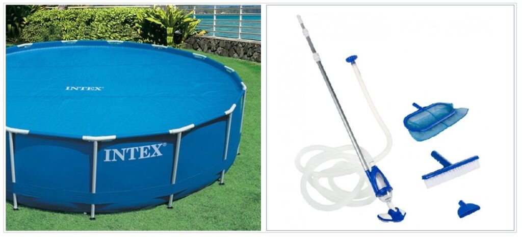 Для цього ми можемо використовувати широкий вибір засобів для догляду за басейном. Одним із варіантів є  набір для чищення INTEX Deluxe . Цей комплект включає: скімер для листя, всмоктуючий очищувач басейну, який підключається до фільтруючого насоса, щітку для стін та алюмінієву штангу.